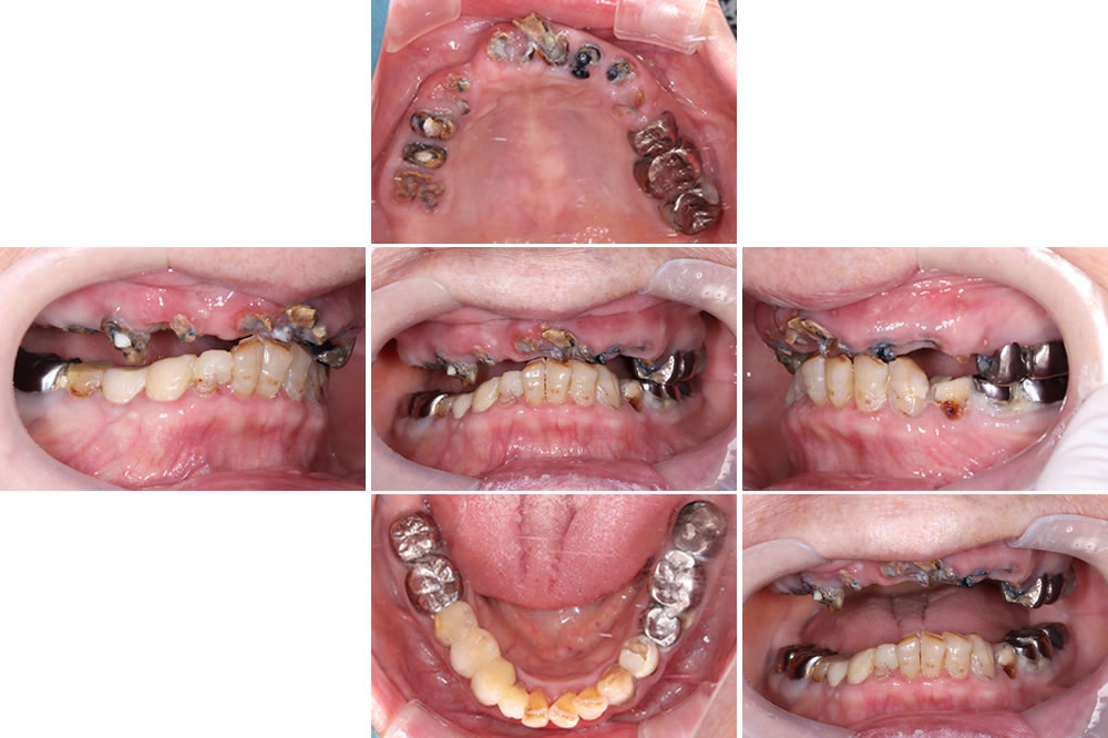 こちらの患者さまは、上顎のかぶせ物の脱離を主訴に来院されました。残存歯は二次的な虫歯が多く保存不可な歯もありました。