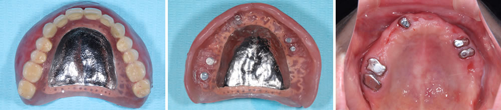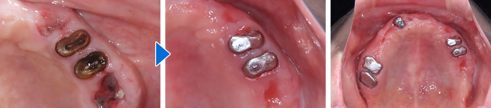 まずは、一先ず咬める状態を作るために上顎には義歯を製作、下顎にはプラスチックのプレートを歯の上から貼り付け、咬み込みが深かった状態を応急的に解消しました。